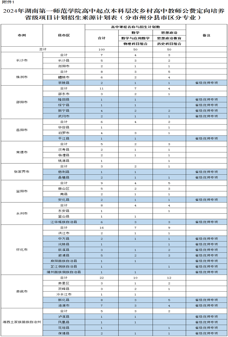高中起点本科层次乡村高中教师公费定向培养省级项目计划招生来源计划表(分市州分县市区分专业)
