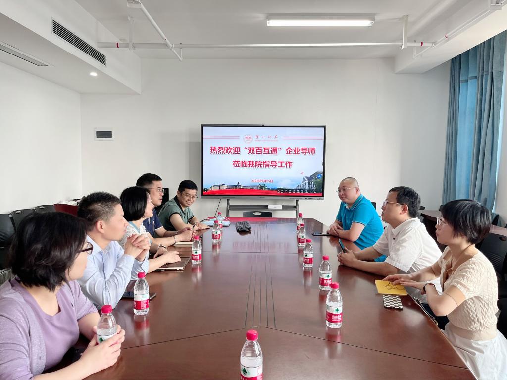 党委书记陈志武、副院长许兰、“双百互通”负责人吴昌义、苏琼、何志坚与企业导师金彪、谢飞同志进行亲切会谈。院部表达了与企业“双百互通”的期待与愿景,加强校企合作是教学与生产的融合,充分发挥学校、企业双方优势及教育为社会、为企业服务的功能。校企合作既为企业培养高素质、高技能的应用型人才,同时为学生实习、实训、就业提供更多空间。希望与贵单位相互支持、互相渗透、双向介入、优势互补,促使教育与生产可持续发展。