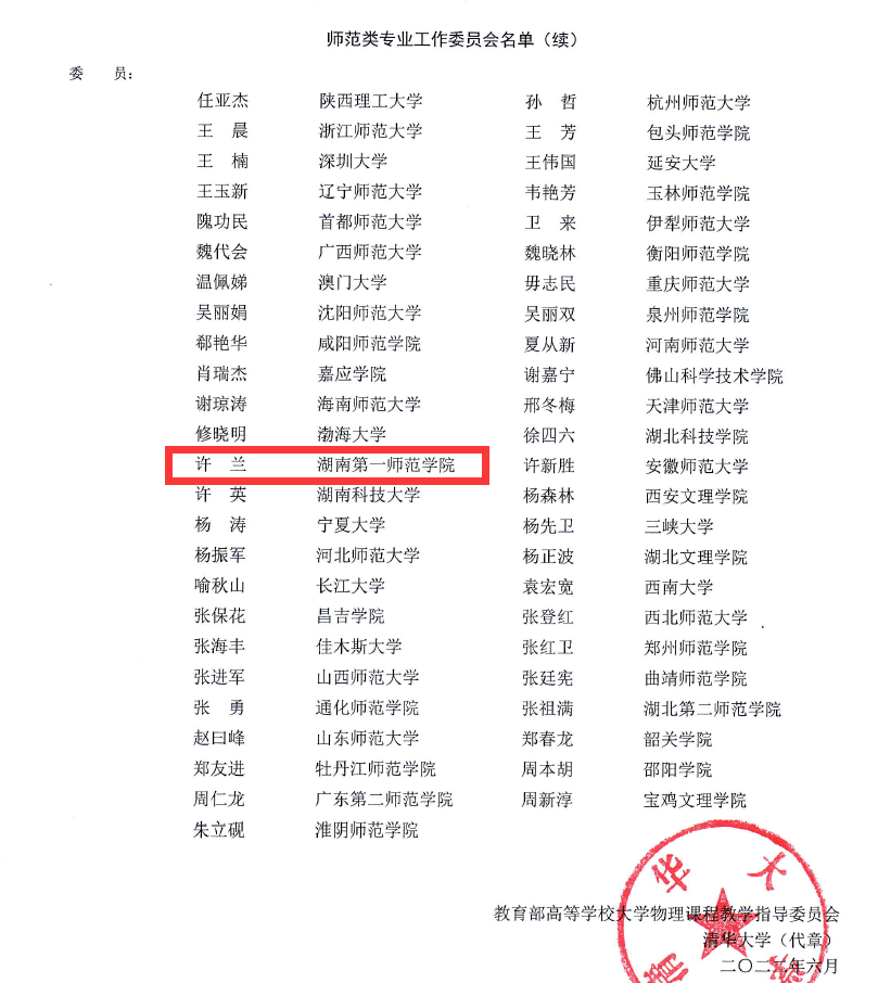 在教育部日前公布的2018-2022年教育部高等学校教学指导委员会委员名单,韩国伦理 许兰教授入选新一届教育部高等学校物理学类专业教学指导委员会师范类工作委员会,在此我们表示热烈祝贺。