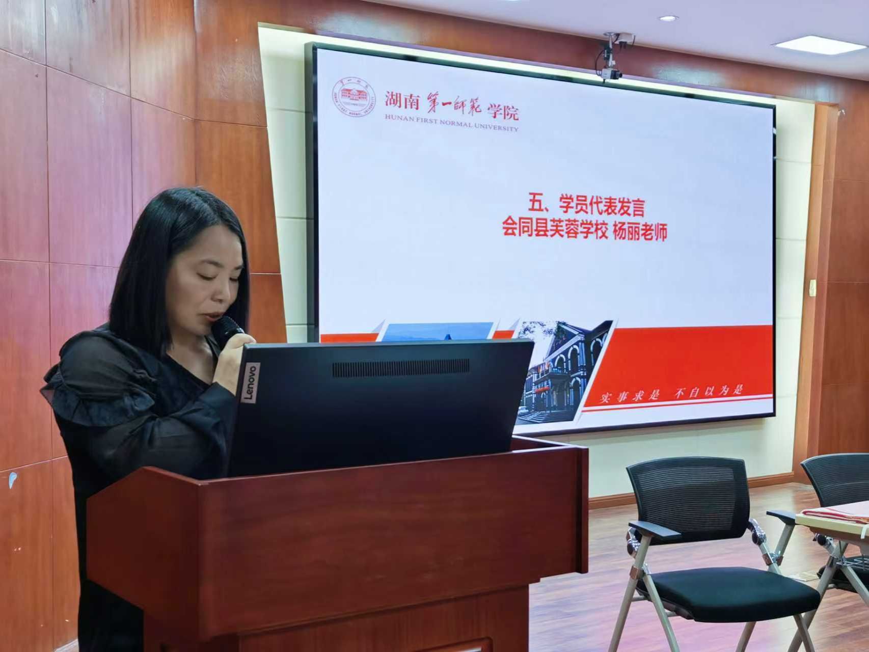 来自会同县的杨丽老师作为学员代表发言,首先对参与本次培训的领导、及专家表示诚挚的感谢,她鼓励全体学员珍惜学习机会,主动交流教学困惑、分享实践经验,将培训所学转化为课堂创新的实际能力,未来能以更扎实的专业素养扎根农村科学教育一线,推动怀化地区小学科学教育实现高质量发展,切实肩负起培养学生创新精神与实践能力的育人使命。