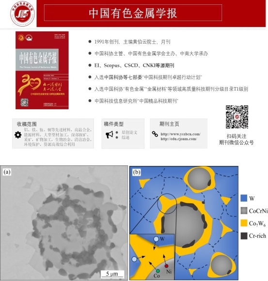 陈慧博士以“W-CoCrNi合金的烧结致密化及其组织与性能研究”为题在中科院1区杂志、有色金属行业顶刊《中国有色金属学报》上发表论文1篇。