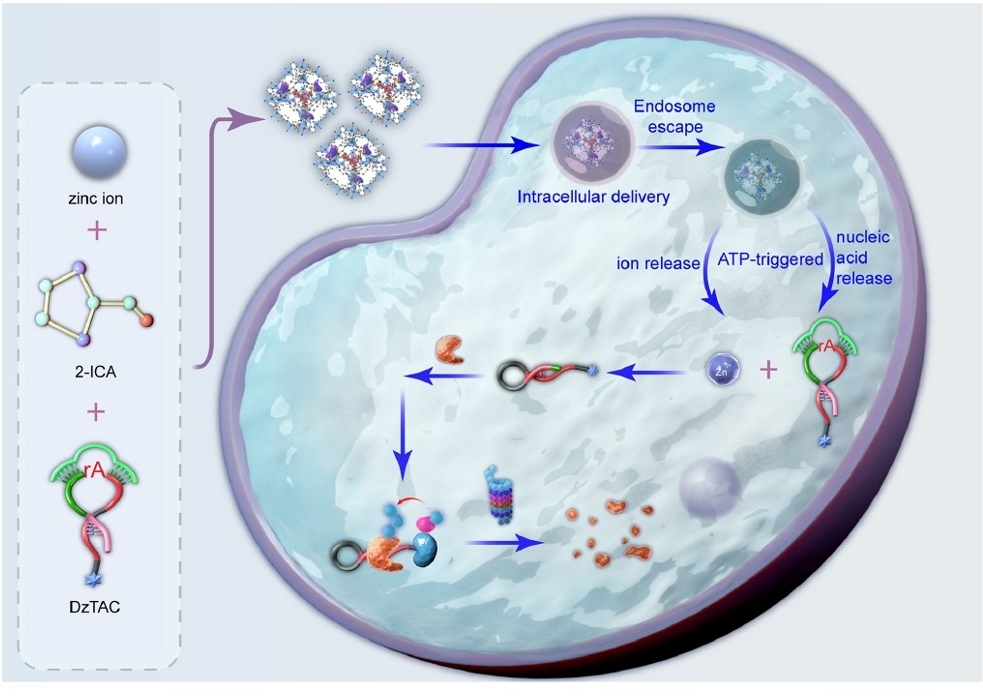 蛋白靶向降解技术是一种前沿药物开发策略,该技术利用双特异性功能分子特异性地靶向并引导目标蛋白至溶酶体或蛋白酶体进行降解,从而有效降低功能异常或具有病原性的蛋白靶标的表达水平。特别是对于那些先前被认为难以药物干预的靶点,此技术展现了显著的疗效,被视作未来药物研发的重要方向。在众多难以成药的靶点中,转录因子尤其引人注目,针对此类靶点,已研发出一系列靶向降解技术。本研究报告了一种新型的DNAzyme诱导的PROTAC(DzTAC),它能够以锌离子依赖的方式选择性地降解NF-kB。此外,还应用一种锌-咪唑金属有机框架(ZIF-90)来包裹DzTA(ZIF-90@DzTAC),这不仅促进了其进入癌细胞的传递,还通过ATP触发的ZIF-90解离实现了锌离子的自我供应。进一步的研究表明,ZIF-90@DzTAC能够增强基于阿霉素的化疗在荷瘤小鼠中的治疗效果。这一发现不仅为转录因子活性的特异性调控提供了新的手段,也为基于功能性核酸的靶向蛋白降解控制开辟了新的途径。这项研究为癌症治疗提供了新的视角,展示了如何通过创新的药物传递系统和靶向机制来提高治疗效果。随着进一步的研究和开发,这种新型的DzTAC技术有望为患者带来更有效的治疗选择。