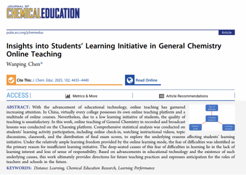 陈万平老师在美国化学学会下属期刊《Journal of Chemical Education》上发表了一篇聚焦在线教育学生表现研究的论文。《Journal of Chemical Education》创刊于1924年,是全球化学教育领域的旗舰SCI期刊。在国际化学教育界,该刊凭借其严格的同行评审机制和对前沿研究的持续关注,享有极高的权威性与广泛影响力。