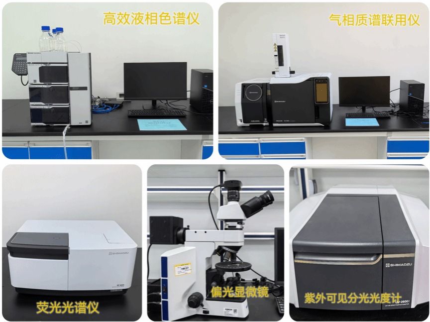 傅里叶变换红外光谱仪、荧光分光光度计、气相色谱质谱联用仪、高效液相色谱仪、激光拉曼光谱仪、原子发射光谱仪。
