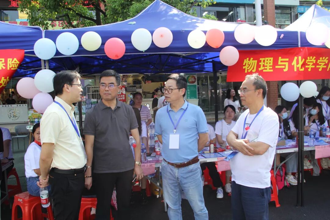党委书记罗成翼、校长童小娇与全体党委委员、校领导班子和相关职能部门的负责人来到物化院迎新现场,检查指导迎新工作,与前来报到的2022级新生亲切交流,向他们表示热烈欢迎,也向参与迎新工作的师生员工表达慰问。学院也十分关心志愿者们的身体状况,为迎新志愿者和新生副班们提供了可口的午餐和充足的饮水。
