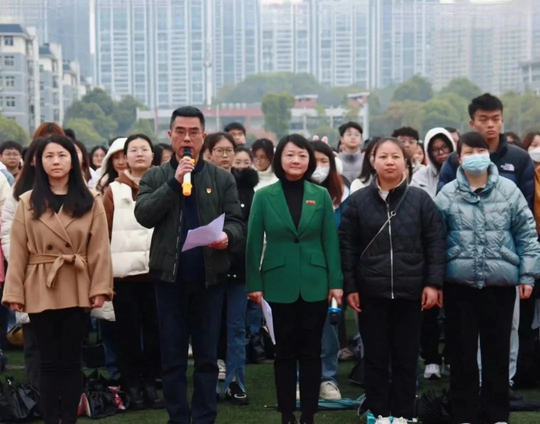 歌声嘹亮,步履铿锵。伴随着激扬的《运动员进行曲》,国旗护卫队身姿挺拔精神饱满,不惧风雨,踏着矫健的步伐,动作整齐划一,送着鲜红的五星红旗迎光而来。随着护旗手振臂一挥,五星红旗从旗杆最低处缓缓上升,在最高处绽放,随风飘扬。全体师生肃然起敬,唱着雄壮激昂的国歌,行注目礼,向国旗致以崇高的敬意。