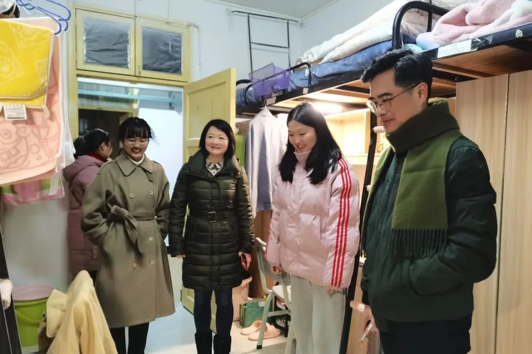 在走访寝室中,老师们检查各个寝室中的卫生情况,对表现优异的方面提出表扬,发现不足问题及时指出并提出针对性解决方案。陈志武书记关心毕业生的住宿情况,叮嘱同学们要注意保暖,关心寝室同学相处方式,倡导寝室氛围需以和为贵。