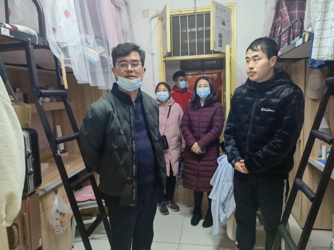 党委书记陈志武、学工办主任曾琳娜、团委书记石慧、辅导员老师廖弘宇、赵锋锋以及院宿保部志愿者来到学生公寓开展本周寝室大检,为在寝室学习的同学,送去关怀与温暖问候。